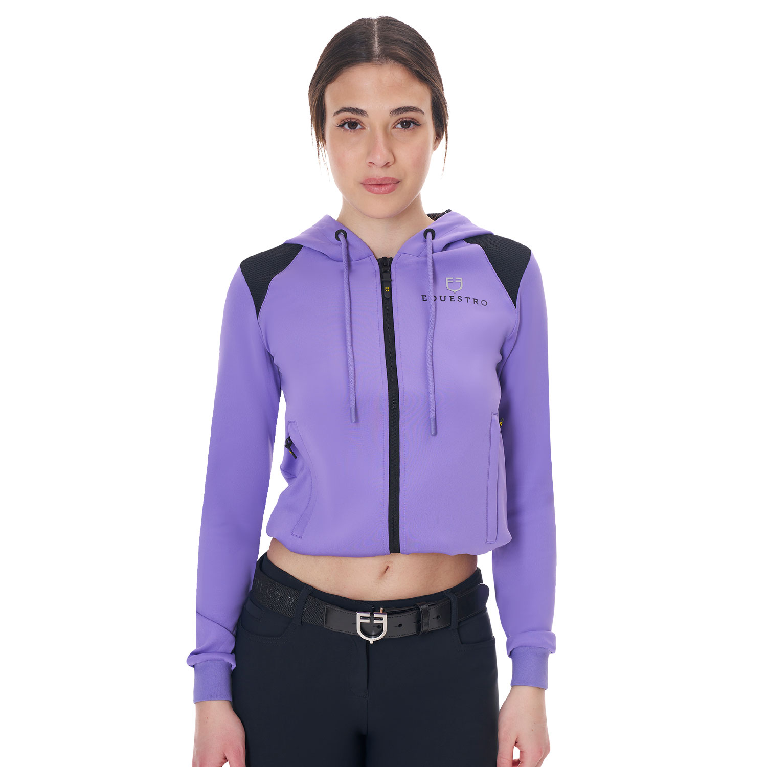 Dotata di zip lunga, cappuccio con cordoncini, polsini e vita con banda elastica per una maggiore vestibilità.