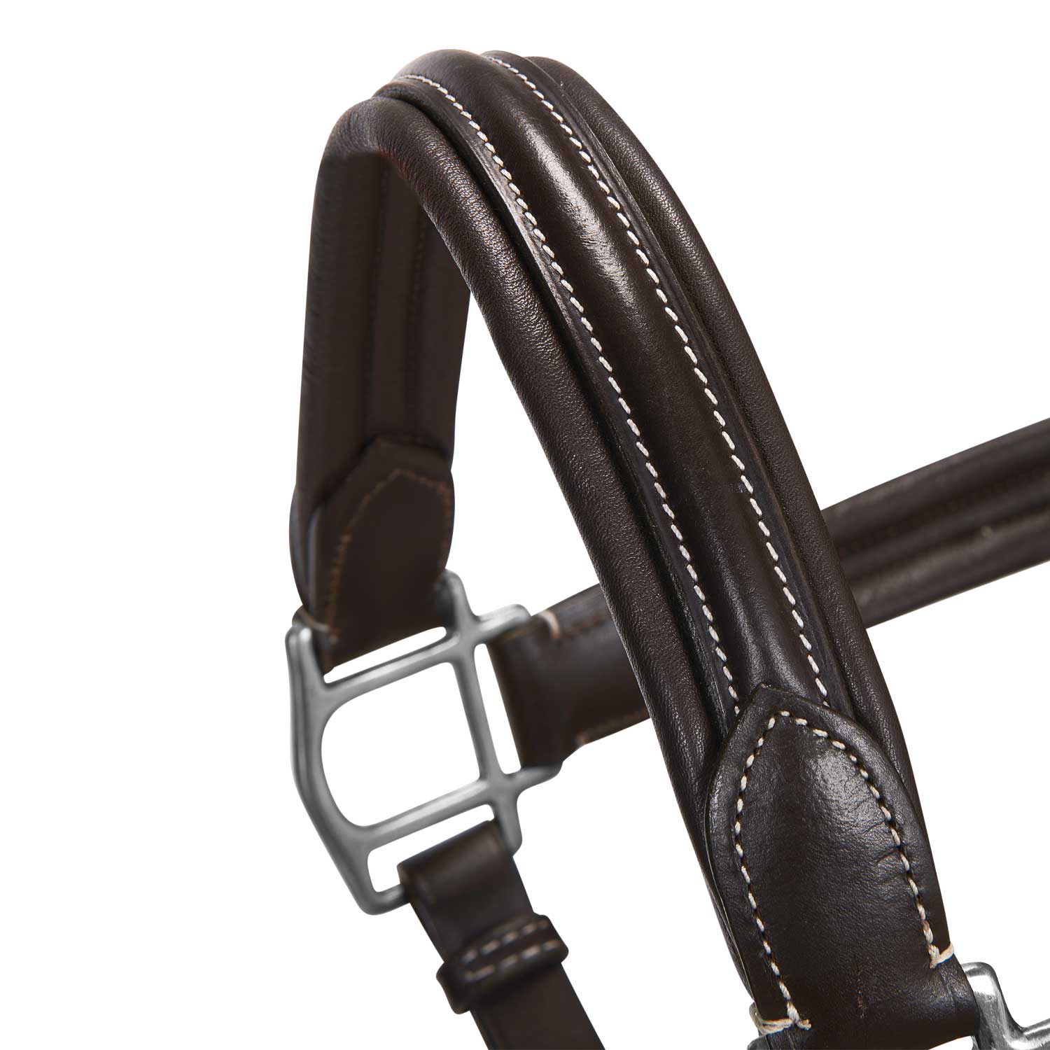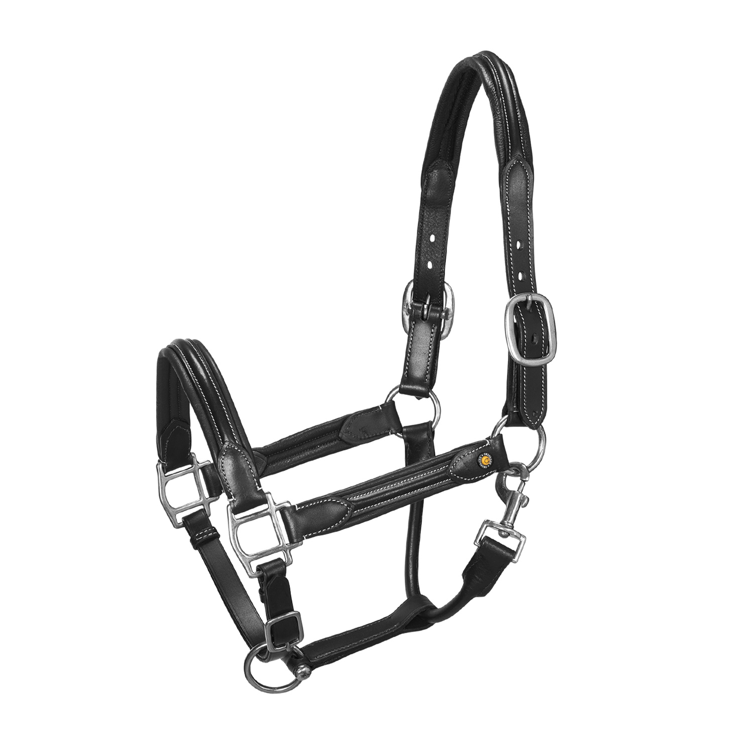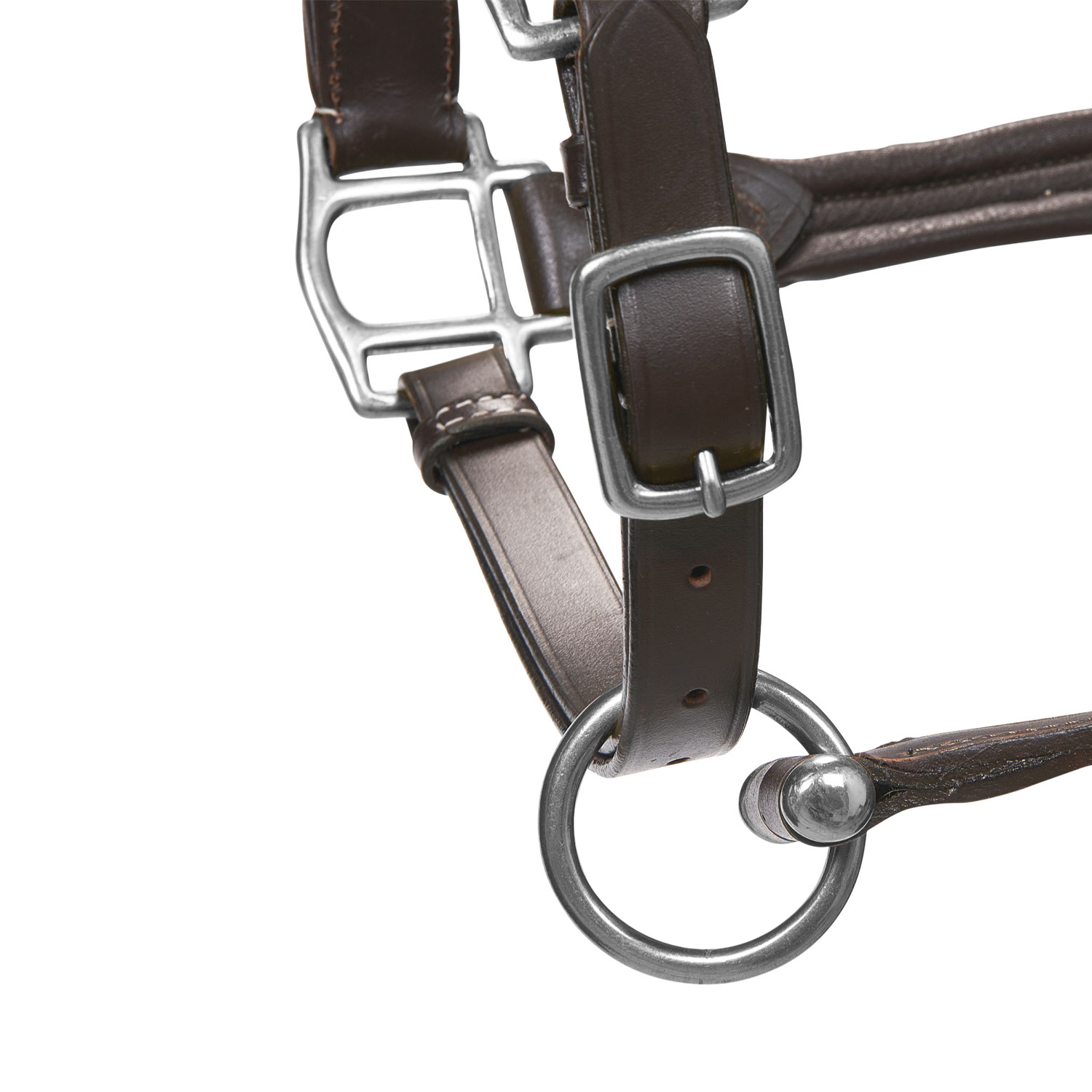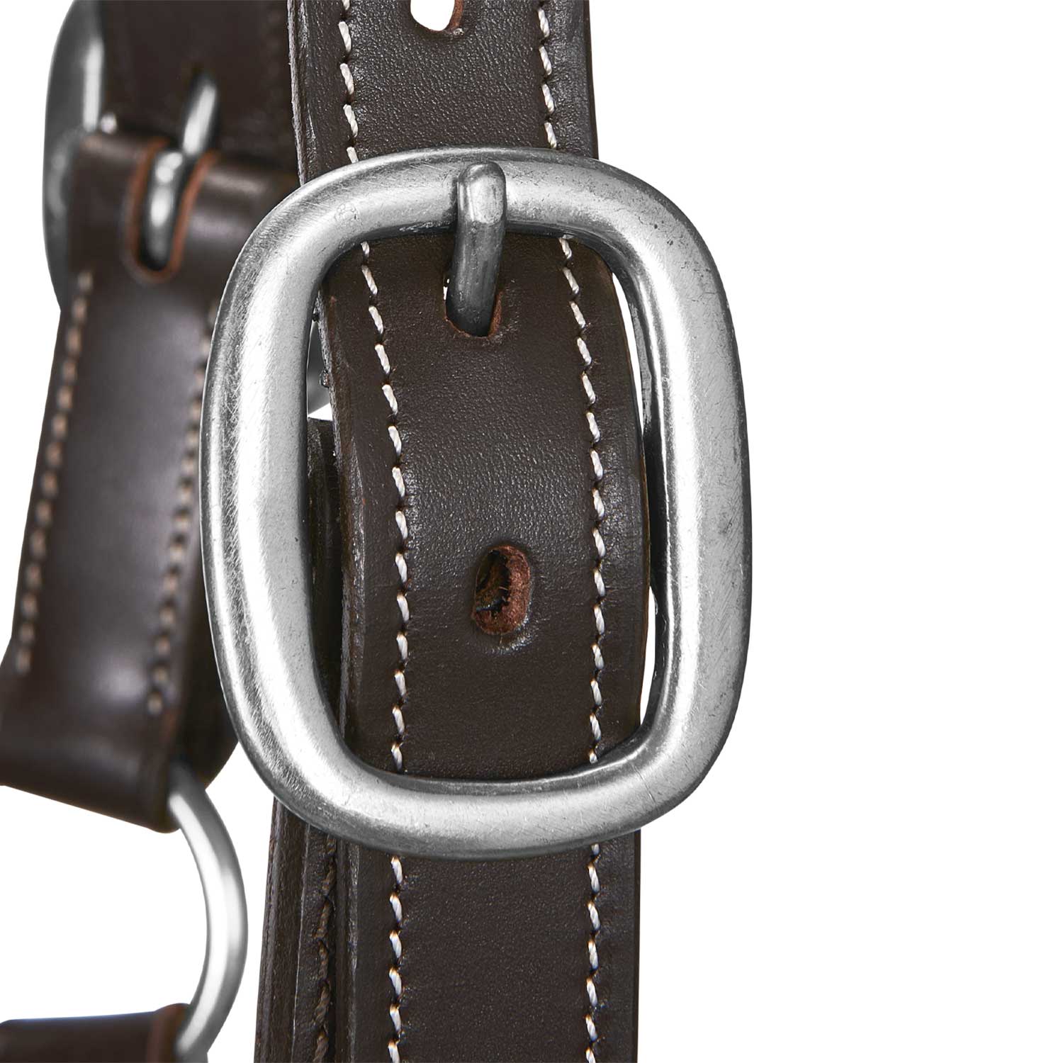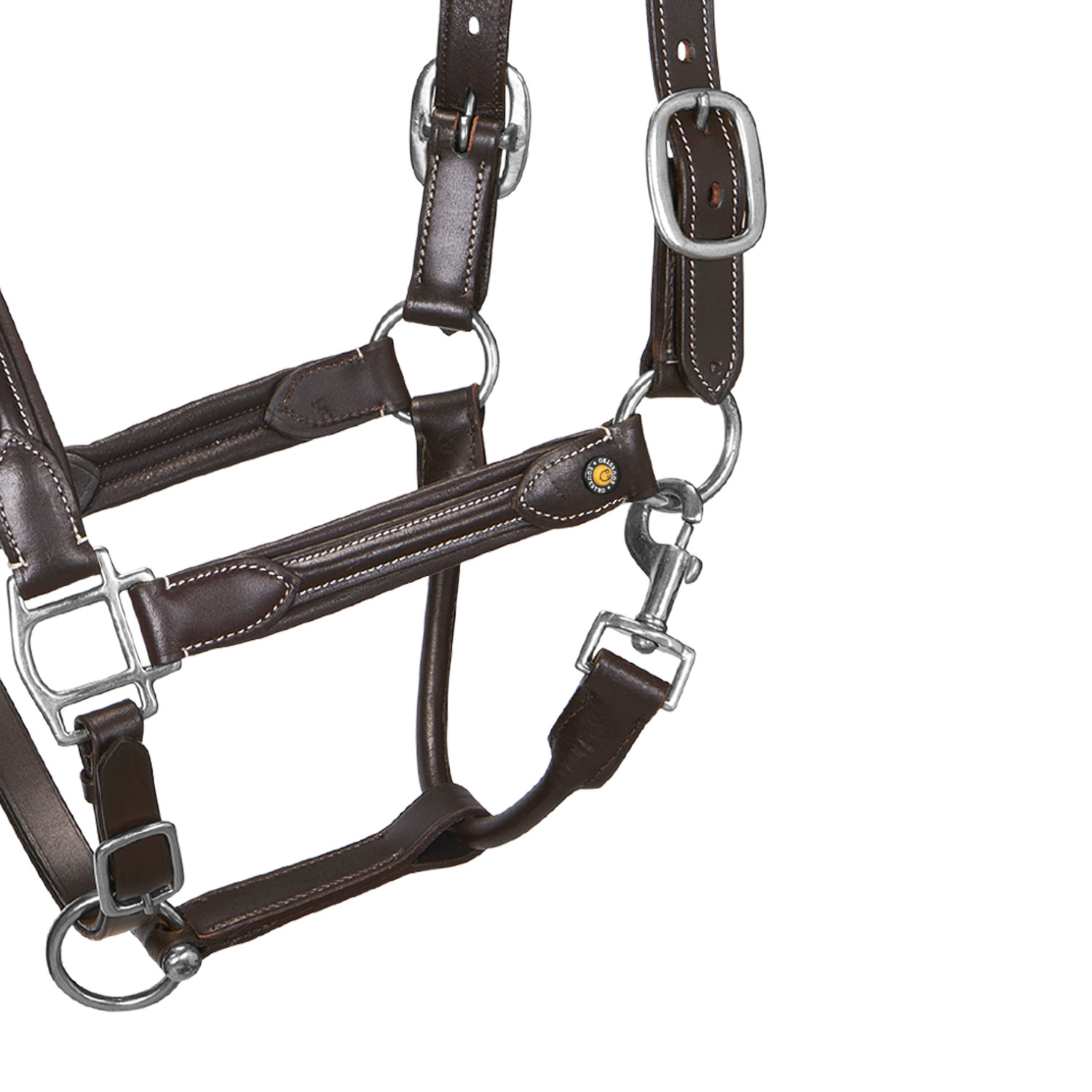 Cavezza in morbido cuoio di alta qualità dotata di fibbie satinate ultra resistenti e chiusura con gancio a moschettone.