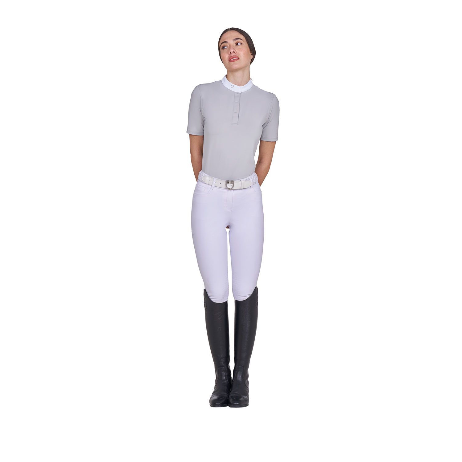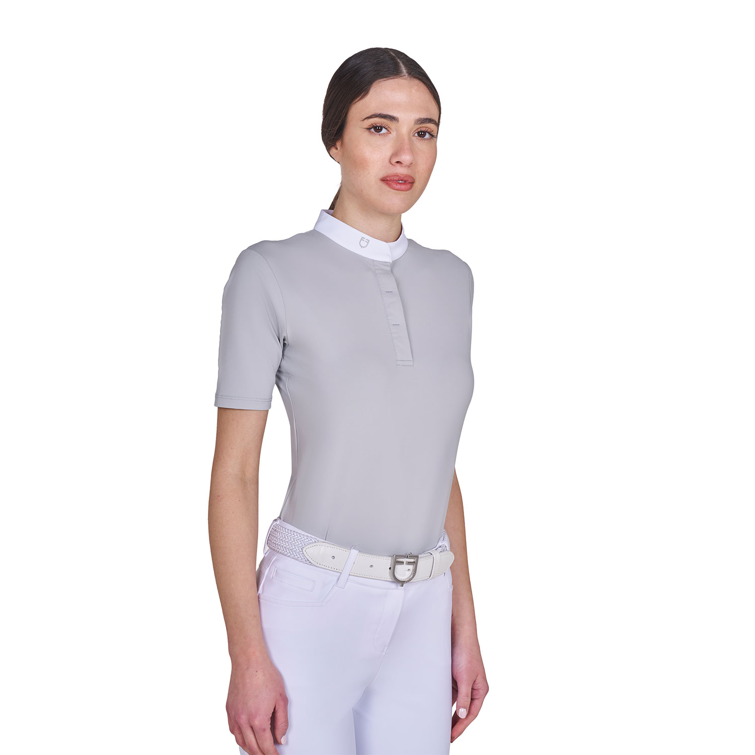 Polo da donna slim fit a maniche corte, progettata per coniugare comfort, performance e stile. Realizzata in tessuto tecnico elasticizzato e traspirante, garantisce la massima libertà di movimento e un’efficace ventilazione, mantenendo la pelle fresca anche durante le giornate più calde o le attività più intense. Il design elegante e funzionale include una pratica chiusura a bottoni nascosti così da donare uno stile ancor più sobrio e lineare. Il taglio femminile segue con armonia le curve del corpo, stringendosi delicatamente in vita per valorizzare la silhouette. L’insieme crea un’eleganza ricercata, perfetta per chi desidera un capo tecnico che si distingue per originalità e raffinatezza. La polo è impreziosita da logo Equestro ricamato sul lato destro del colletto.