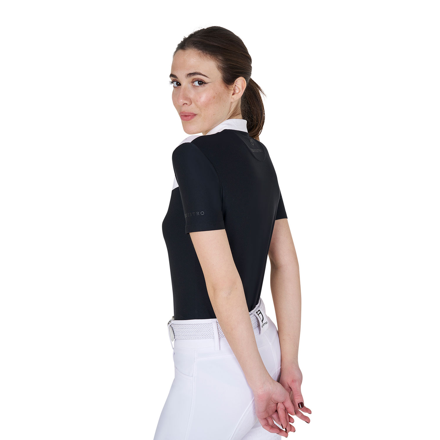 Polo da donna slim fit a maniche corte, progettata per coniugare comfort, performance e stile. Realizzata in tessuto tecnico elasticizzato e traspirante, garantisce la massima libertà di movimento e un’efficace ventilazione, mantenendo la pelle fresca anche durante le attività più intense. Il design elegante e funzionale include una pratica chiusura a zip, impreziosita da un’esplosione di strass sulla parte superiore in cotone a contrasto. Il colletto anch’esso in cotone è logato Equestro, conferendo al capo un dettaglio distintivo. Il taglio femminile segue con armonia le curve del corpo, stringendosi delicatamente in vita per valorizzare la silhouette. L’insieme crea un’eleganza ricercata, perfetta per chi desidera un capo tecnico che si distingue per originalità e raffinatezza.