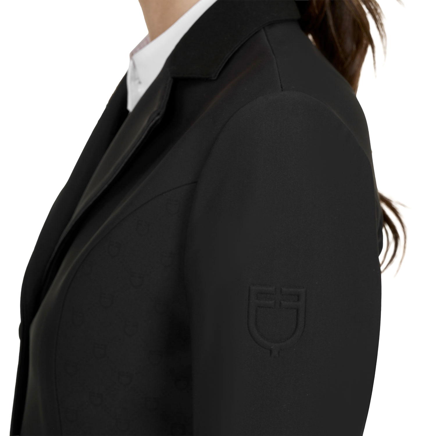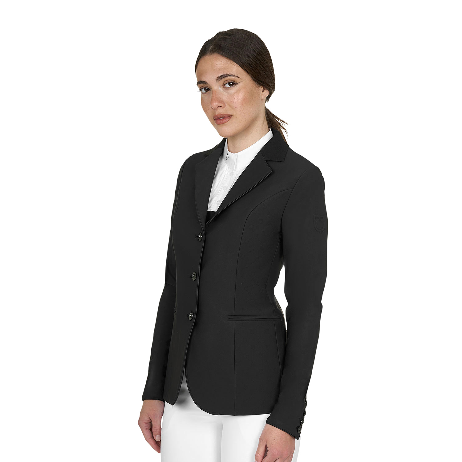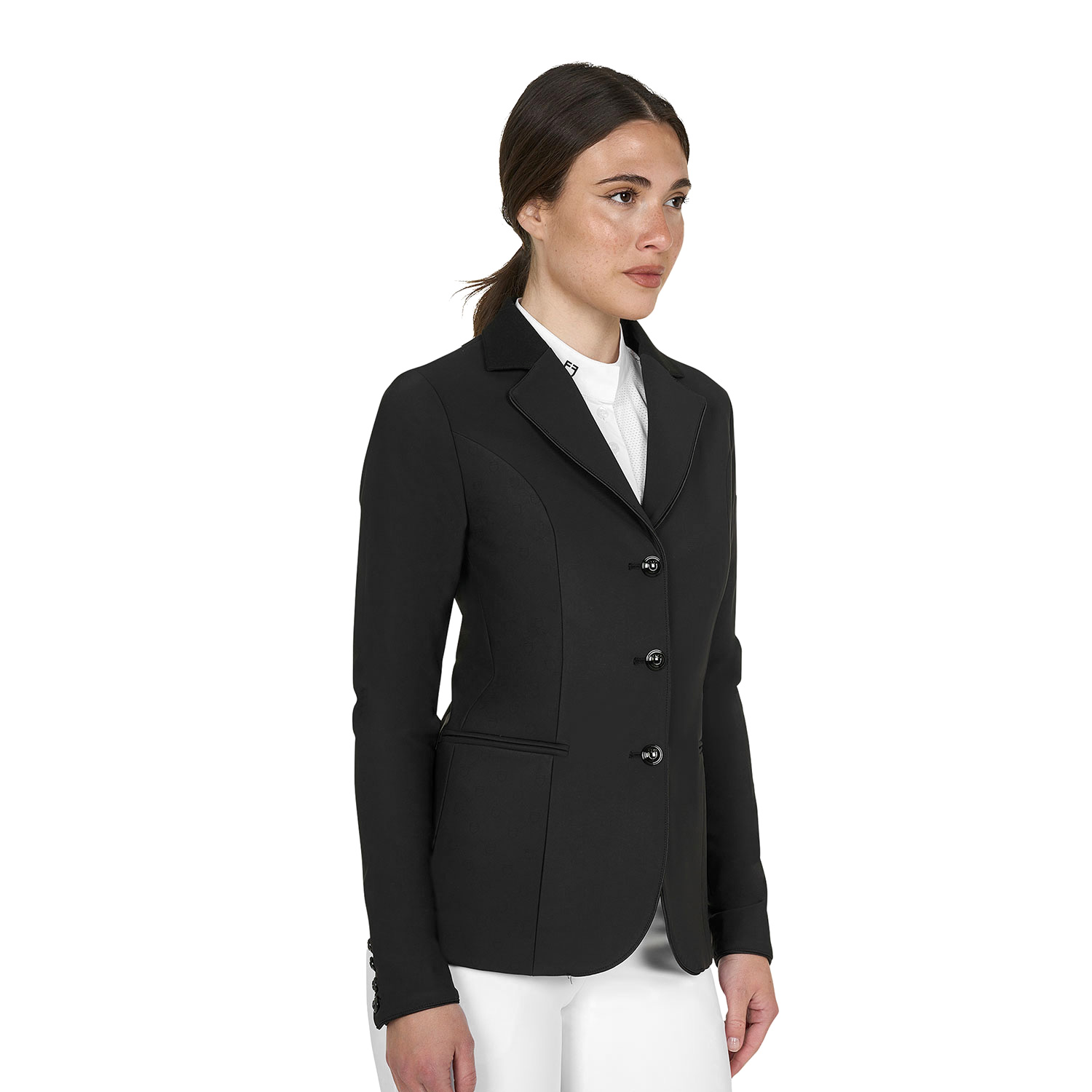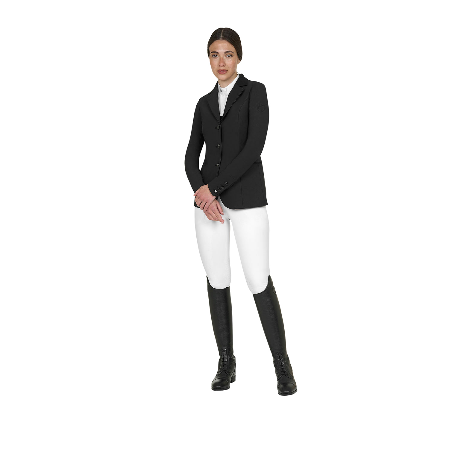 Giacca da concorso da donna realizzata in tessuto tecnico traspirante e ultra leggero di alta qualità, studiata per garantire performance elevate in gara. Il modello presenta chiusura a tre bottoni, tasche laterali e logo Equestro in rilievo sulla spalla, elemento iconico del brand.